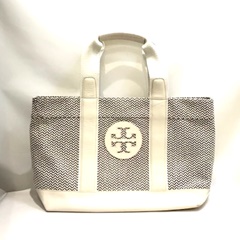 #TORY BURCH トートバッグ を買い取らせて頂きました。網目の地模様に白でトリーバーチのマークを施し、白と黒の色使いで、お洒落さもアップ。A4サイズも入る大きさで収納抜群です。