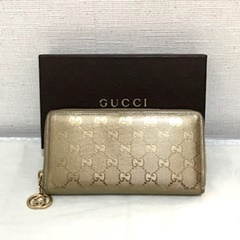 #GUCCI ラウンドファスナー長財布 ゴールド色を買い取らせて頂きました。こちらは、華やかな中にも落ち着いた雰囲気があり、もともと実用的で人気のグッチですが、幅広い年代の方にお使い頂けます。