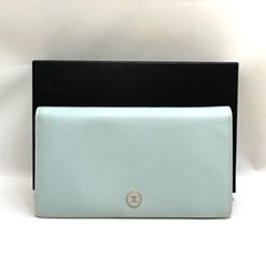 #CHANEL 2つ折り長財布を買い取らせて頂きました。お色は淡いライトブルー。シン プルなデザインですが、 ココボタンモチーフがついており、上品ななかにも、高級感があります。
